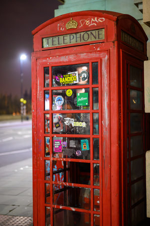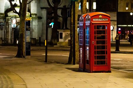 London, England, UK - January 2, 2020: red Telephone Booth at night, red phone booth is one of the most famous London icons