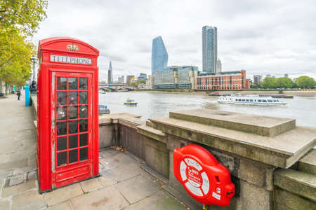London, UK - October, 2019: red telephone booth on Victoria Embankment