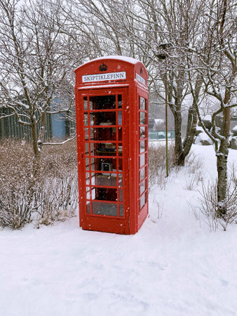 Red telephone booth in winter, Reykjavik in Iceland