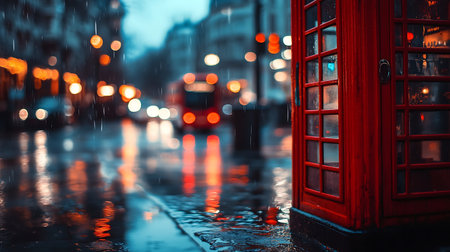 A red telephone booth stands on a wet city street in the rain. The streetlights reflect in the puddles, creating a warm glow.