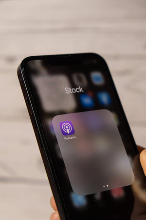 Gdansk, Poland - February 2023. Apple iPhone with Podcasts icon app on the screen. App Store icons app on screen and wireless headphones