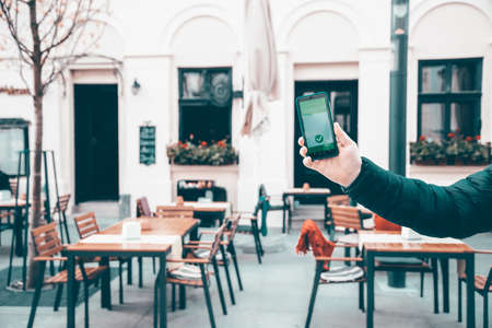 Vaccinated person using immunization certificate on smartphone at the restaurant or terrace.