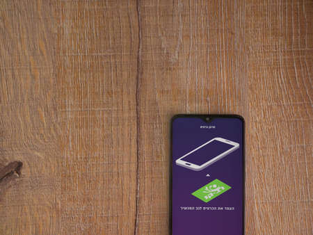 Lod, Israel - July 8, 2020: Rav Kav Online app launch screen with logo in hebrew text on the display of a black mobile smartphone on wooden background. Top view flat lay with copy space.