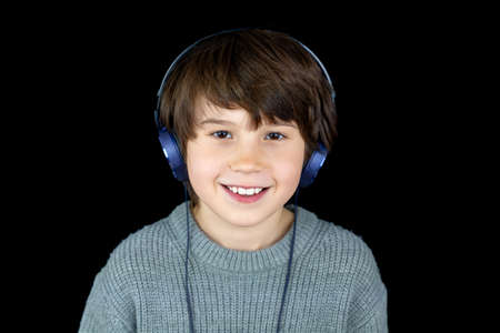 Portrait of a young teenager with headphones on black background. Music lover. Digital technology concept. Generation z.