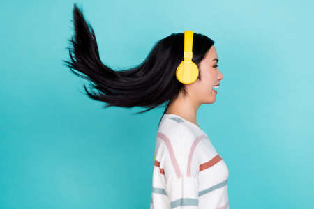 Profile photo of funny millennial lady listen music wear headphones pullover isolated on turquoise color background