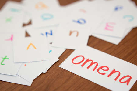 Wooden toy cubes with letters on a wooden background. Selective focus.