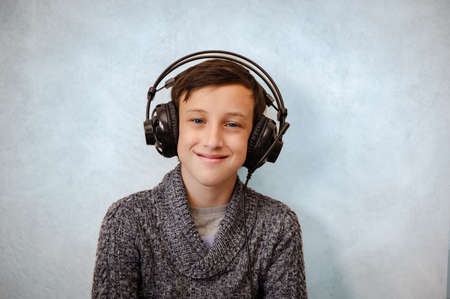 Boy in headphones listening to music. Looking at camera. Audiobook