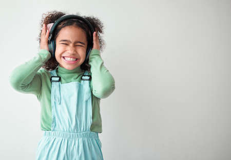 Grace was in all her steps. Shot of an little girl standing alone e and listening to music through headphones against a grey background.