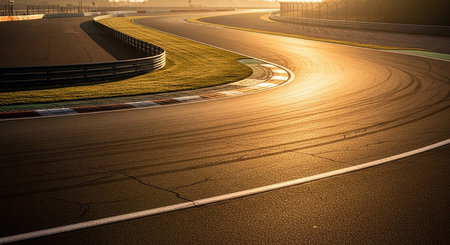 Deserted race circuit at sunrise, smooth lanes and open copy space, no cars or people around