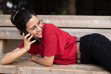 Young attractive woman talking through the phone and smiling in a park, sit down in a bench