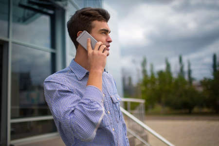 Business man talking on a phone. Handsome guy calling a phone on a blurred background. Conversation concept. Copy space.