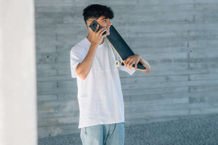 young man with mobile phone on the street wall in the city, stains or paint chips on the wall without intellectual property
