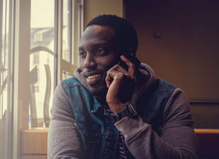 Portrait of African man sitting in the chair and talking on the Smartphone. Male is laughing at joke, having great time.