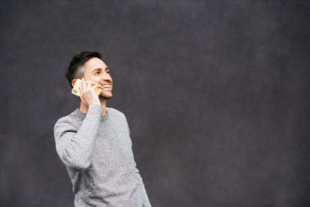 Portrait of a man in casual clothes, using a smartphone, against a gray background