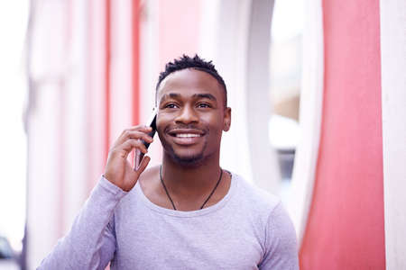 African american male on a phone call with his mobile device outside a building during the day while smiling Young black male talking on a phone while commuting to work