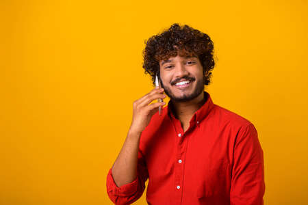 Portrait shot of an african man having a phone conversation. Isolated on the orange background.