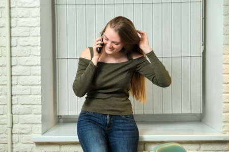 Young trendy woman in casual cloth talking by the mobile cell phone working on laptop from home