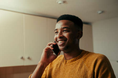 Man is talking to friend on phone at home. Action. Man is having normal friendly conversation on phone. Man is talking on phone standing at home