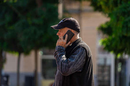 Timisoara, Romania - September 15, 2021: Man talking on the phone and walking on the street. Real people.