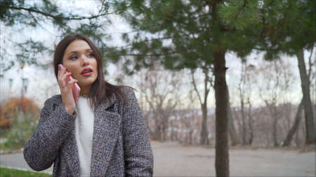 Girl teenager in the autumn park speaks by phone. A beautiful girl calls on her mobile and speaks against the background of trees.