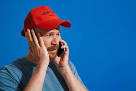 White ginger man wearing cap talking on mobile phone isolated over blue background