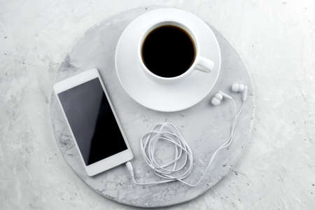 top view smartphone with empty screen and coffee cup on a marble table in coffee shop