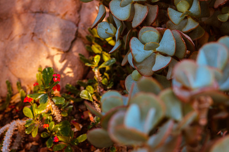 Rectangular arrangement of succulents, cactus succulents in a planter, above view, toning.
