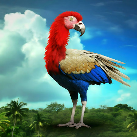 A vibrant parrot stands majestically against a lush tropical backdrop.