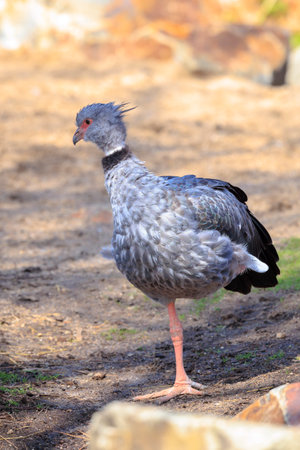 Closeup of a Southern screamer, chauna torquata, walking between the rocks