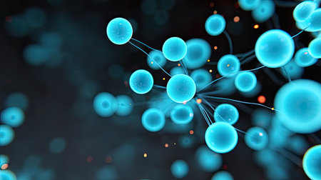Vivid illustration of blue molecules with glowing connections set against a dark background, ideal for science, technology, and research themes.