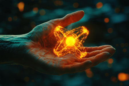 A hand holding a glowing orb that looks like a cross. The orb is surrounded by a bright orange glow, and it is emitting some kind of energy. The image has a futuristic, otherworldly feel to it