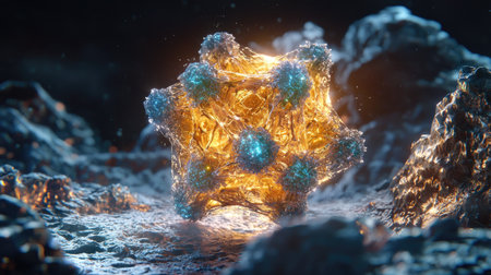 Intricate AAV virus particle displayed in 3D with molecular-level realism, highlighted by a bioluminescent glow and enhanced depth in microscopic fluid.