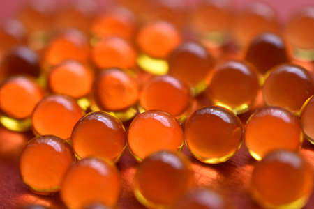 Close up of oil filled capsules suitable for: fish oil, omega 3, omega 6, omega 9, vitamin A, vitamin D, vitamin D3, vitamin E