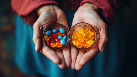 An elderly woman's hands are holding two cups of pills. The concept of treating the elderly.
