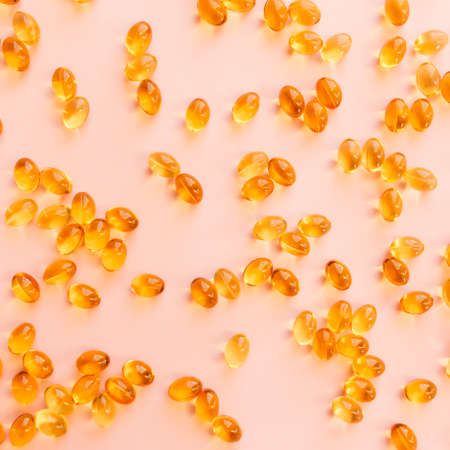 Fish fat oil, vitamine on the peach background. Omega 3 capsules. Fish fat on the table.