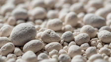 A detailed macro shot of numerous small, white, porous pumice stones scattered closely together.