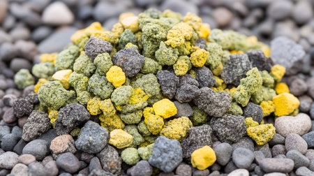 A macro shot of a pile of yellow, green, and grey granular pellets with a rough, porous, and uneven texture.