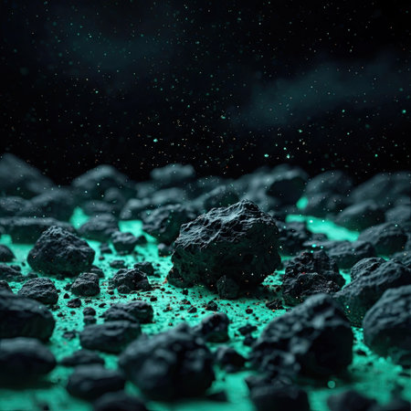 This abstract image features dark, textured rocks illuminated by a vibrant, ethereal green light. The composition highlights a low-angle perspective with a backdrop of a starry sky. The scene is rendered in a digital art style. Suitable for creative projects, design assets and visual content for diverse applications.