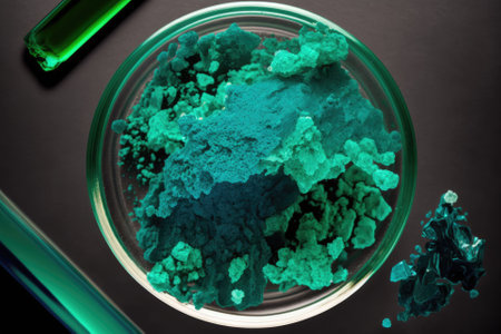 Magnesium nitrate powder in Petri dish on green background. Nitromagnesite, hexahydrate. Saltpeter. Fertilizer stimulates the process of photosynthesis, eliminates signs of magnesium chlorosis.