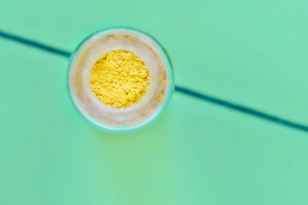 A hand in a gray medical glove holds a bottle of white powder, light blue background, space for text, top view.