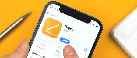 Kharkov, Ukraine - January 10, 2022: Apple Pages app icon close-up. Woman uses the application on Apple iPhone 12 mini