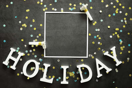 Frame made of lights bokeh flares and sparkler isolated on black concrete night texture - holiday New Year's Eve, New Year background banner, top view with space for text