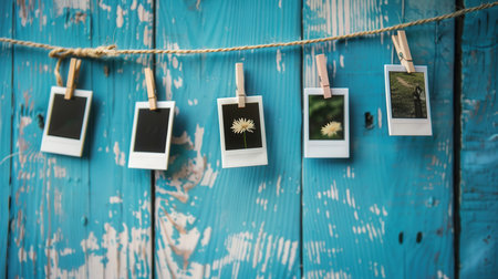 Colorful Polaroid photos are displayed on a string with clothespins, set against a vibrant blue wooden background featuring empty space.