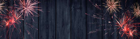 HAPPY NEW YEAR Silvester Party Festival background banner panorama long greeting card - fireworks on rustic black wooden texture, with space for text
