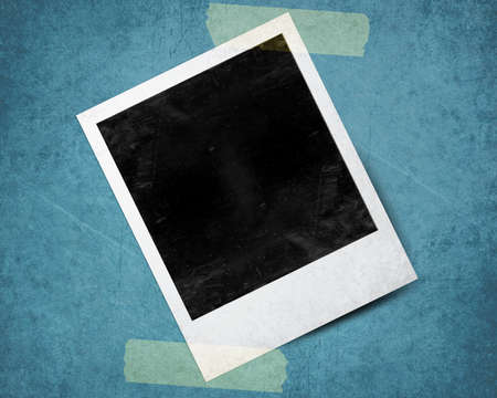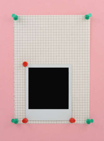Cork notice or bulletin board with blank instant camera photo print and several sheets of untidy torn notepaper. Space for copy.