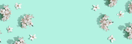 Apple tree floral frame. Bright summer background. Spring white fruit flowers. Repeat spring texture. Creative trend composition. Many springtime elements. Blank layout. Horizontal banner. Green mint