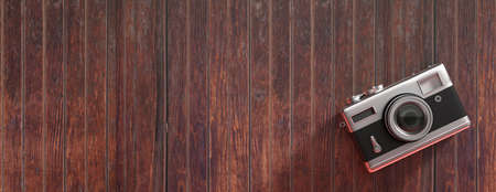 Photo camera vintage style. Retro old fashioned camera on wooden background, banner, top view, copy space. 3d illustration