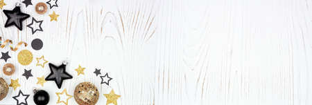 New Years Eve corner border of gold and black confetti stars, decorations and streamers. Top view over a white wood background.