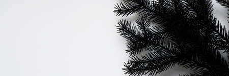 Happy New Year and Merry Christmas black concept. Background of black branches of a Christmas tree on a black background. Long format for web