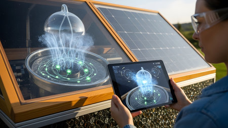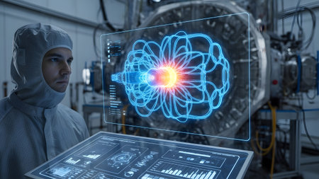 Technician showing technician in cleanroom suit examining a holographic display of a fusion...